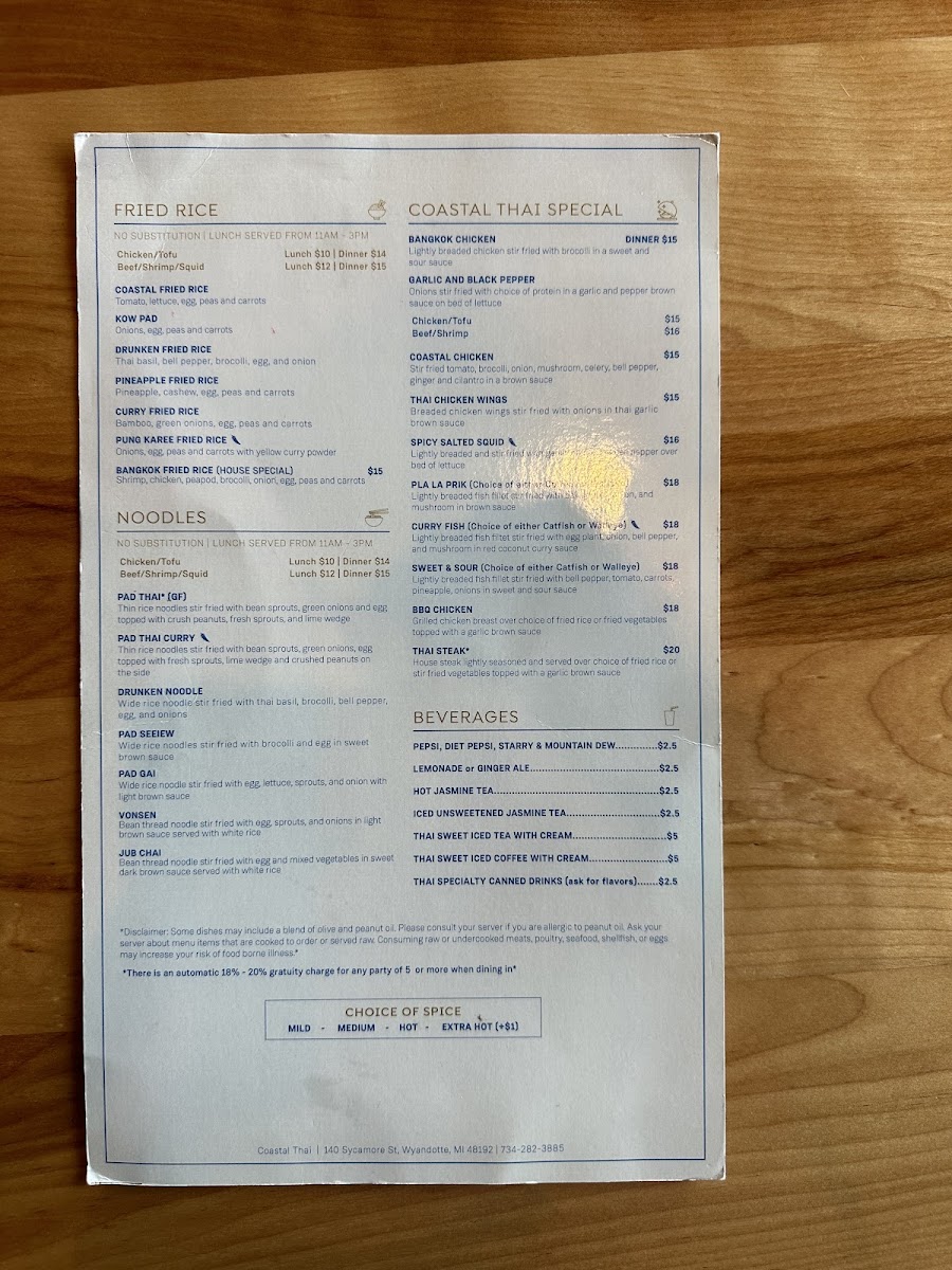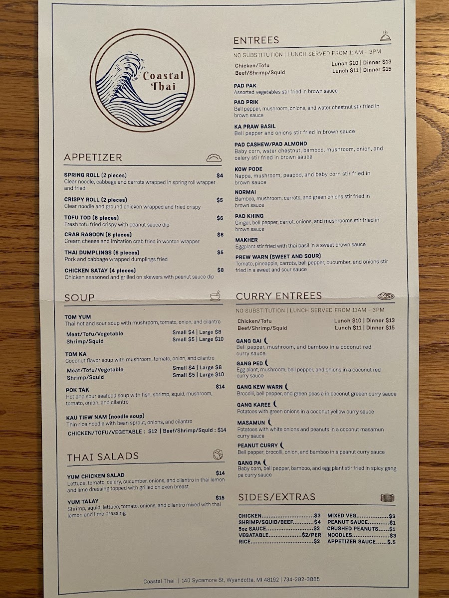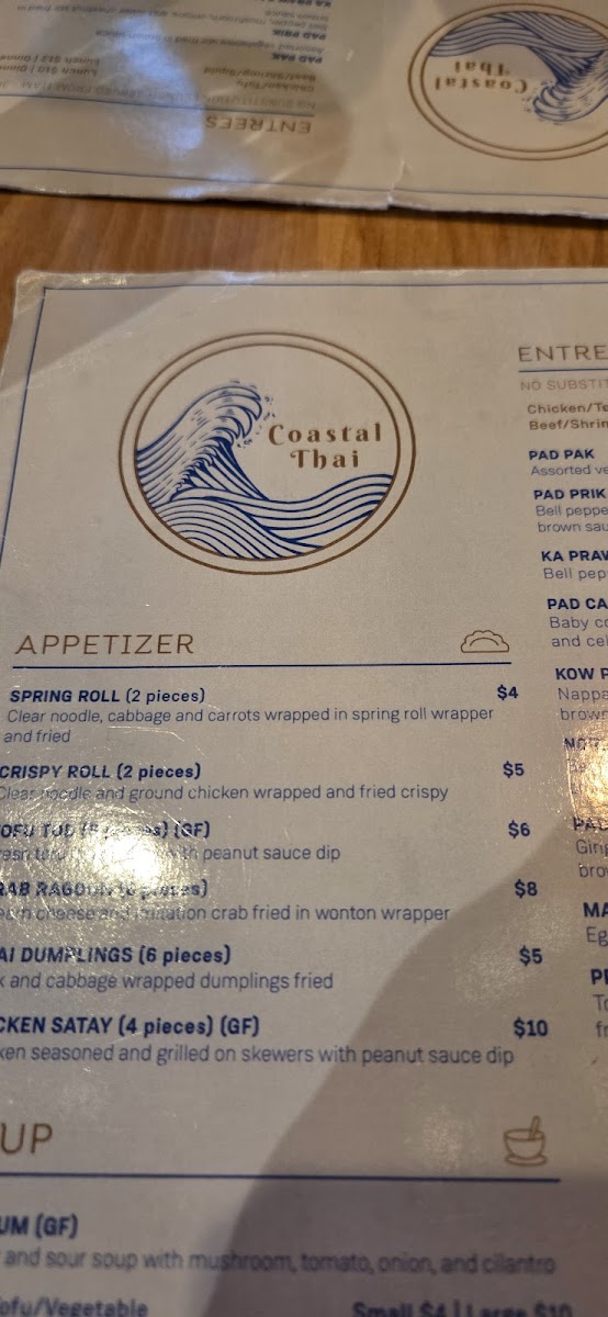 Nestled at 140 Sycamore St in Wyandotte, MI, Coastal Thai invites you to embark on a culinary adventure through the vibrant flavors of Thailand. Whether you're a fan of the classic Chicken Pad Thai or looking to indulge in the rich tastes of our Drunken Noodles with Chicken, our menu is designed to tantalize your taste buds. Don’t miss out on our mouthwatering Beef and Chicken Satay or dive into the exquisite Veggie Pad Thai Curry. Each dish, from the crispy Crab Rangoon to the aromatic Gang Gai, is crafted with fresh ingredients and authentic spices that will leave you craving more. Perfect for sharing or enjoying solo, our Coastal Thai offerings promise to delight every palate. Join us soon to experience the unforgettable tastes that await!